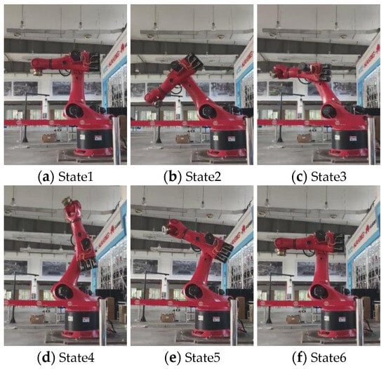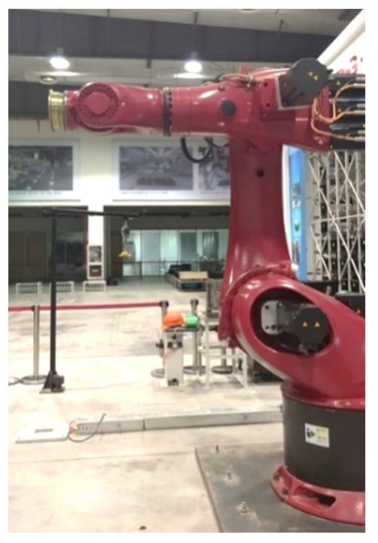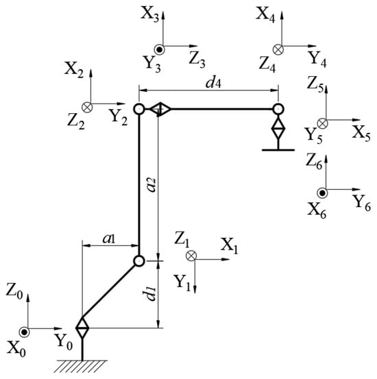 The D-H method is applied to establish the kinematic model of the research object, which is the industrial robot. The D-H parameters of the robot are listed in Table 1. The industrial robot is illustrated in Figure 1, and the coordinate systems of the robot are illustrated in Figure 2.