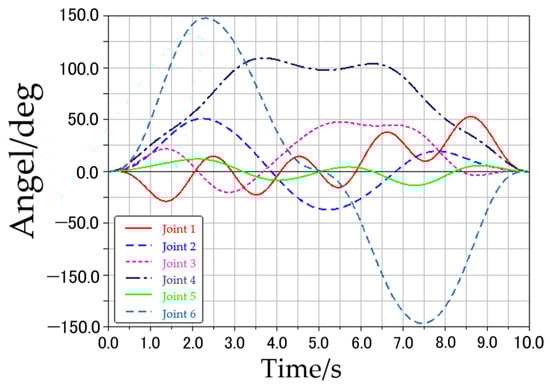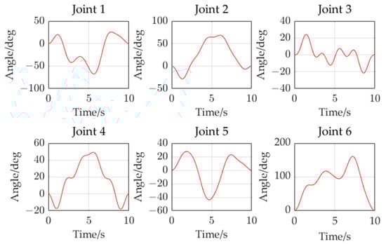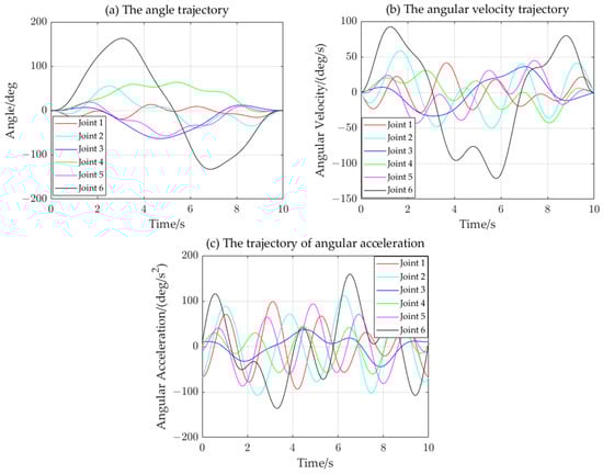 The base frequency of the Fourier series is 0.1 Hz, and the running time of the trajectory is 10 s. In Equations (18)–(20) above, is taken, that is, the fifth-order Fourier series is adopted. The main problem in obtaining the optimal trajectory is to find the coefficients in Equation (18). Each joint contains 11 coefficients, and there are 66 unknown parameters to be solved. In the case of multiple coefficients, a genetic algorithm can be used to solve them.