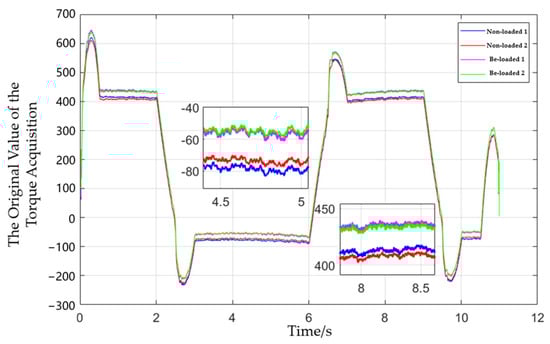 Figure 10 illustrates the dimensionless torque values obtained. Specifically, at the horizontal position of joint 3, the corresponding time instances are recorded at 4.75 s and 8.25 s. To ensure accuracy, an average duration of 50 ms is considered before and after these time points. Subsequently, the data obtained from “no load 1” and “no load 2”, respectively, are subtracted from the averaged results of “load 1”. The same procedure was followed to produce eight distinct results for “load 2”, as detailed in Table 7.