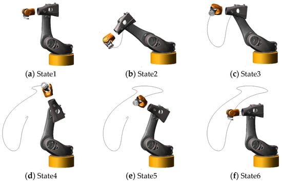 In the experiment, the trajectory illustrated in Figure 4 was adopted. To ensure safety during the experiment, Adams was applied to simulate the trajectory in advance. The simulation trajectory is shown in Figure 11, from which any potential robot interference or collisions can be observed.
