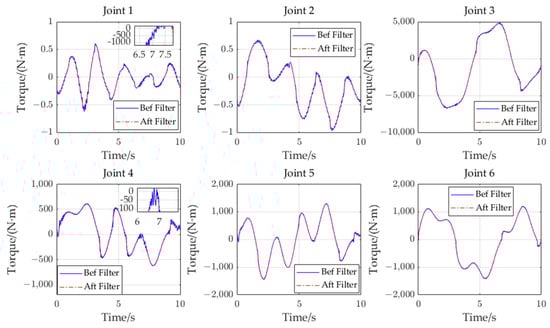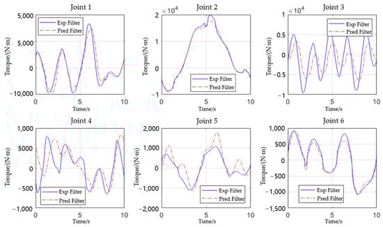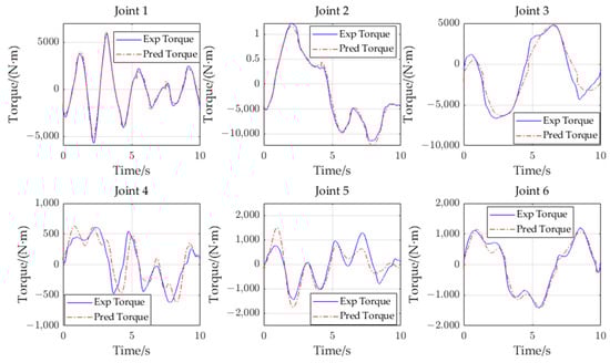 According to the comparison results shown in Figure 15, the predicted torque of joints 1, 2, and 6 are consistent with the experimental torque. Although the predicted torque of joints 3, 4, and 5 exhibit a significant local deviation from the experimental torque, the trend of torque prediction is consistent.