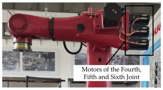 In the process of deduction and simulation, each connecting rod is assumed to be an independent model and the satisfactory outcome of identification is produced. However, in the experimental robot, the motors of the back three joints are all positioned at the first end of connecting rod 3, as shown in Figure 18. The torque is transmitted to joints 4, 5, and 6 through the transmission mechanism. As the identified objects are not independent linkages, the dynamics model is not as accurate as required.