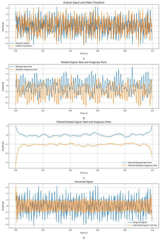 Figure 1A displays the original signal alongside its Hilbert transform. Figure 1B shows the real and imaginary parts of the signal after rotation. Figure 1C illustrates the real and imaginary components of the signal following the application of a low-pass filter post-rotation. Figure 1D contrasts the extracted signal against the original signal. Through the process of Hilbert transformation, coordinate rotation, low-pass filtering, and inverse coordinate rotation, the target frequency signal was successfully isolated.