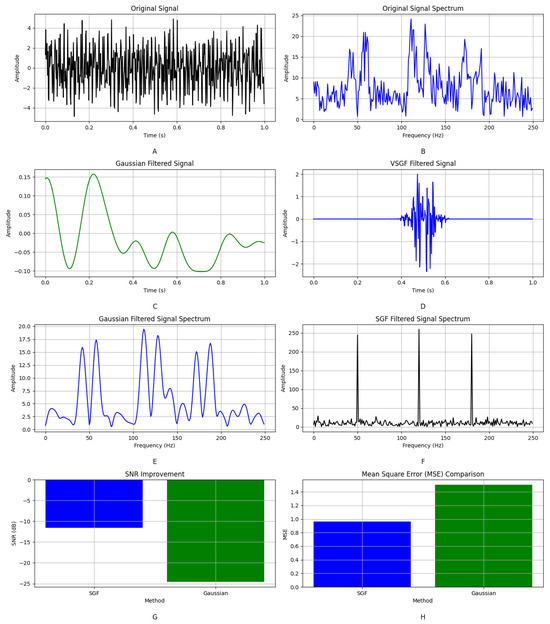 Figure 4G,H compare the SGF, and the traditional Gaussian filter in terms of signal-to-noise ratio (SNR) and mean-squared error (MSE). Figure 4G shows the improvement in SNR, while the right graph (Figure 4H) shows the comparison of MSE. The SNR improvement graph indicates that SGF performs excellently in low-SNR environments, significantly improving the SNR. Figure 4H shows the MSE. The MSE graph indicates that the SGF better preserves the integrity of the signal while reducing noise, resulting in a lower MSE. The SGF demonstrates superior performance in signal processing, particularly in signal fidelity and noise suppression. By comparing SNR and MSE, the SGF is superior to the traditional Gaussian filter.