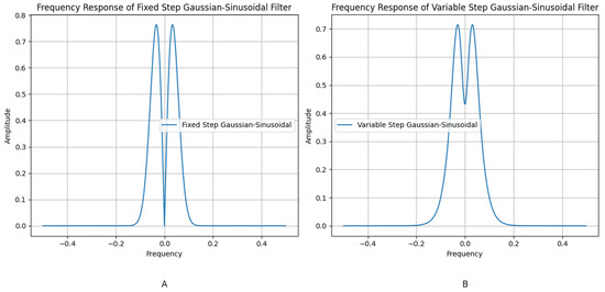 Figure 5A shows the frequency response of the Fixed-Step Gaussian-Sinusoidal Filter. It can be observed that the fixed-step filter exhibits prominent peaks within specific frequency ranges, indicating strong responsiveness at these frequencies and effective filtering of other components.