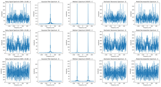 Figure 9A shows the frequency spectrum of the signal under different SNRs. Due to noise, the spectrum contains significant clutter and irrelevant frequency components, obscuring the true frequencies of the original signal.