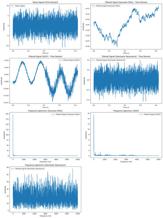 This paper utilizes the CWRU dataset for signal processing to compare the performance of various filtering methods, including Gaussian filtering, Variable-Step Gaussian-Sinusoidal Filtering combined with rotating coordinate transformation (VSGF), and stochastic resonance filtering. Simulations were performed on synthetic signals embedded with multiple frequency components within Gaussian noise at a signal-to-noise ratio (SNR) of −20 dB. The results were analyzed comprehensively in both the time and frequency domains to evaluate the effectiveness of each method. Figure 10 illustrates the analysis results of the three methods.