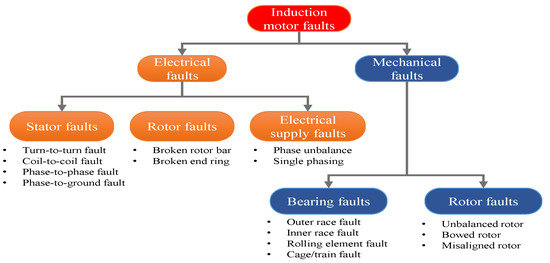 However, as illustrated in Figure 1, induction motors (IMs) are vulnerable to various faults that can significantly affect their overall performance, reliability, and safety. The two primary types of faults found in induction motors (IMs) are mechanical faults, which account for 45–55% of the faults, and electrical faults, which make up 35–40% of the faults [21].