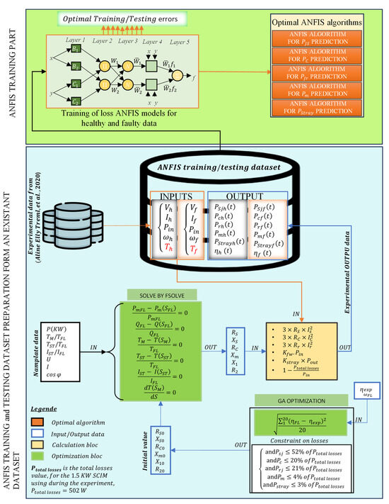The occurrence of any failure in induction motors results in an elevation of motor losses, hence causing a subsequent decline in motor efficiency. If incipient defects are not identified and resolved promptly, they will lead to motor failure in the future. A decrease in efficiency at a specific threshold might serve as an indicator and contribute to the prevention of fault propagation and the subsequent reduction in associated losses. Hence, with regular monitoring of the operational efficiency of induction motors, it becomes feasible to identify potential defects and strategize maintenance actions accordingly. This approach can result in the implementation of cost-effective maintenance practices for induction motors. In the case of a singular BRB defect, there is a decrease in efficiency (Δη) of 2%. However, as the fault’s severity intensifies, this loss can escalate to 3% or 4%. In the event of a malfunction in the cooling system, there is a potential for heightened thermal strain on the insulation and windings, resulting in a steady state decline in Δη to 8% [4]. The observed correlation between fault occurrences and efficiency levels suggests a mutual reliance between losses and faults, hence establishing losses as potential markers for detecting faults. To offer fault detection approaches based on loss analysis, this study focuses on extracting loss characteristics from in-service IMs in both healthy and faulty conditions. The objective is to assess the impact of losses on each BRBF (basis function) and determine their contribution to fault identification. Table 3 summarizes the efficiency of motor depending on BRBF severity. Additionally, Figure 5 provides a summary of the proposed method’s flowchart.