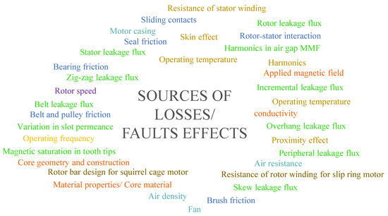 In this section, we will give the result of a survey of inefficiency sources, which means the internal and external sources that contribute to motor efficiency decrease. As shown in Figure 4, we account for a minimum of 33 sources of inefficiency in induction motors that we call common sources, which establish an interdependency between losses and faults through motor parameters. Even if one of these sources occurs, this can conduct in motor efficiency decrease. These sources impacted the motor power losses, and when a fault occurs in IMs, it causes some of these sources. Table 1 enumerates the sources of losses, while Table 2 correlates these sources with specific motor failures.