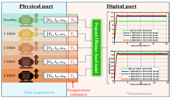 The present paper is structured in the following manner. Following the introductory portion, Section 2 presents our research background, including fault detection techniques, the contribution, and the novelty of the proposed study. In Section 3, we introduce the proposed technique, which utilizes IM losses and efficiency as condition indicators for default detection and diagnosis through the application of Digital Twin (DT) technology. Section 4 provides an account of the outcomes and subsequent analysis according to the proposed methodology. In this study, we conduct a comparative analysis between our proposed method and existing approaches that utilize vibration signals for broken rotor bar fault detection and diagnosis. Our findings demonstrate that our method outperforms these existing methods in terms of performance while also exhibiting a reduced computing cost. Lastly, in Section 5, we present our concluding remarks and discuss potential avenues for future research.