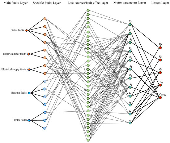 The preceding analysis demonstrates a correlation between the occurrence of defects and losses in induction motors. The objective of this section is to determine the individual impact of each loss on the reduction in efficiency associated with a particular defect. Next, we will establish one, two, or three sets of losses that enable the distinct identification of a certain defect. These losses, whether employed individually or in combination, will serve as condition indicators. This study involves the graphical representation of losses and efficiency for both healthy and defective motors, with the aim of observing the effects of faults on machine losses and efficiency. As shown in Figure 6, from the common sources, we develop a fault diagnosis network.