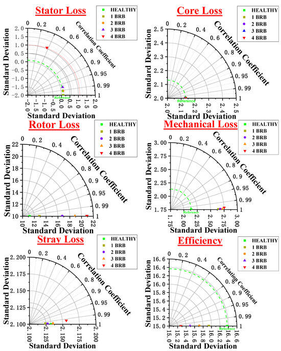 Taylor diagram illustrating the predicted losses and efficiency of the proposed model for 1, 2, 3, and 4 broken rotor bars.
