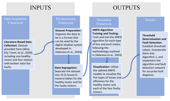 The initial performance of a newly developed machine is characterized by its ability to operate at rated conditions while consuming a minimal amount of energy at its rated power. Nevertheless, the performance of the system may decrease with time as a result of several circumstances, including the process of aging, thermal cycle, environmental impact, etc. To ensure the machine operates at its highest level of efficiency, the implementation of maintenance practices is crucial as it directly contributes to the reduction in energy consumption. Despite the significant correlation between maintenance and energy efficiency, both domains are frequently investigated in separate ways from each other. In a study conducted by [2], the significance of maintenance and frequently employed energy efficiency strategies is examined. The study makes it clear that maintenance is a fundamental practice of energy saving. In another study, the authors conducted a comprehensive literature review to examine the relationship between maintenance practices and energy conservation in commercial refrigeration environments [34]. The researchers found that the implementation of good maintenance practices plays a substantial role in enhancing the operational efficiency of refrigeration equipment. Lewis et al. conducted a study in which they analyzed three case studies within North American enterprises. Their findings indicated a significant correlation between energy management and maintenance management, suggesting that these two aspects are interdependent [3]. In [35], the author employed the same dataset used in the present study to introduce a fault detection method for induction motors. However, challenges such as computational costs and low detection precision pose obstacles to the accuracy and real-world implementation of the method. In a separate investigation, a model with a quantitative approach was established to make a connection between energy consumption, maintenance failure rates, and production within the context of energy-intensive manufacturing [36]. The objective of the suggested methodology is to establish a correlation between the power losses of a machine and its defects through motors’ dynamic parameters and fault sources by identifying the optimal combination of losses that enables the detection of machine faults. An examination is carried out on the origins of power losses in induction motors (IMs) within their operational environment and their influence on the estimated energy efficiency. Simultaneously, an investigation is conducted into the factors that affect IMs and lead to defects. This enables the identification of the distinct impact of each fault on motor parameters, and consequently, its losses. This is accomplished by implementing an induction motor loss-based fault detection network. Then, a case study on broken rotor bar fault is considered to validate the method. The condition monitoring of broken rotor bars can be achieved through digital shadow in two ways: with motor nameplate data when data are not available enough [29], or with historical data when operational data are available [32]. This methodology entails the continuous monitoring of data and the establishment of a pre-determined threshold. This threshold serves as a reference point, beyond which the identification of broken rotor bar faults becomes possible. To the best of our knowledge, there hasn’t been any research that has employed losses as a technique for identifying faults in induction motors by taking into account the motors’ dynamic parameters and the common sources between these parameters and the faults. The fault detection technique shown in Figure 3, while Figure 9 summarized the main steps of the proposed method.