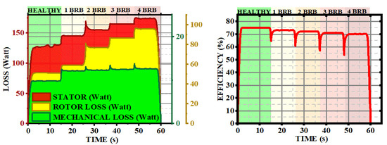 As shown in Figure 10, the simulation illustrates that the presence of a broken rotor bar (BRB) in induction motors results in an elevation of stator joule loss, mechanical loss, and rotor loss. As a result, a decline in efficiency and performance is evident. The proposed approach is substantiated by the application of a simple condition-based algorithm, which proficiently detects and classifies BRB faults by taking into account efficiency and loss thresholds.