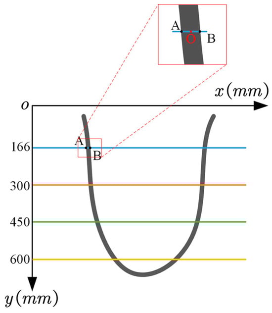 As shown in Figure 5, in the pixel coordinate system, taking the time interval as an example, the point on the centerline of the rope was denoted as , and the coordinates of the corresponding edge points on both sides were and . The coordinates of point were denoted as , and the coordinates of point were denoted as . During rope movement, at time , the coordinates of points and in the image were and , respectively, while the coordinates of point were denoted as . At time , the coordinates of points and in the image were and , respectively, and the coordinates of point were denoted as . Therefore, the displacement of the tail rope at this monitoring point within the time interval can be obtained as follows: