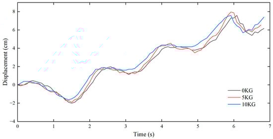 As shown in Figure 14, the displacements of the tail rope at the same monitoring point and load condition but at different operating speeds could be acquired through the above experiment. The figure revealed that as the operating speed was accelerated, the peak and valley values of the swing amplitude at the same monitoring position grew and appeared earlier. Figure 15 displays the displacement comparison of the tail rope at the same monitoring point and operating speed but under different load conditions. Notably, at the same operating speed, the swing displacements at the same monitoring point and different load conditions were largely consistent.