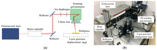 Femtosecond laser machining experimental setup, (a) Schematic of the laser transmission path, (b) experimental platform.