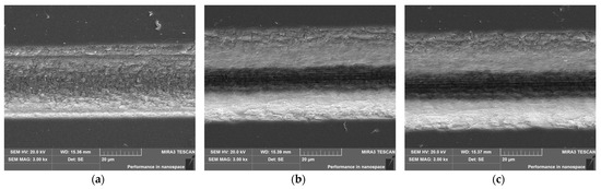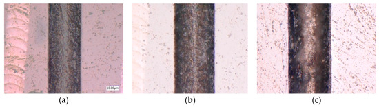 Figure 3 shows the microgroove structure and surface morphology observed under SEM at a magnification of 3000× for the same laser power conditions. As shown in Figure 2a and Figure 3a, at a laser power of 6.5 W, the laser power density applied to the surface of SCD is relatively low, resulting in a weaker material ablation effect. Consequently, the machined microgroove structure remains well-preserved, with a smooth surface and regular, crack-free edges. However, the depth and width of the microgroove are comparatively small, indicating low machining efficiency. When the laser power is increased to 11.1 W, the ablation depth and width of the machined microgroove on the SCD surface increase significantly, as shown in Figure 2b and Figure 3b. Despite the increased laser power, the surface quality of the laser machined area remains good, with regular straight edges and no significant cracks. As the laser power further increases to 16.5 W, the ablation depth and width of the microgrooves exhibit a slight increase, but the heat-affected zone becomes more pronounced. This is accompanied by the appearance of cracks and irregular material fragmentation at the groove edges, leading to a deterioration in the surface quality of the machined area, as shown in Figure 2c and Figure 3c.
