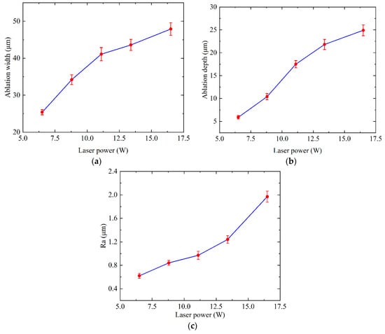 Influence of laser power on (a) ablation width, (b) ablation depth and (c) Ra.