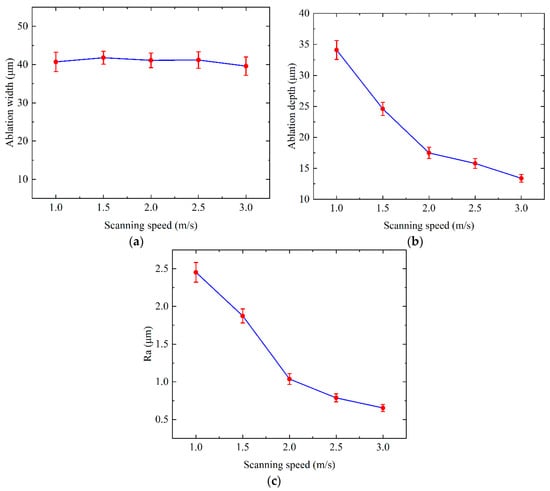 Influence of scanning speed on (a) ablation width, (b) ablation depth and (c) Ra.