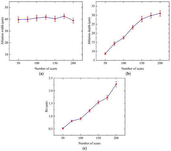 Influence of number of scans on (a) ablation width, (b) ablation depth and (c) Ra.