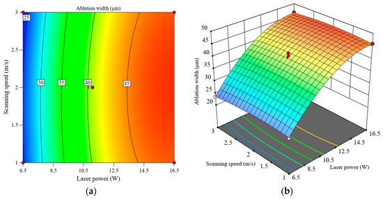 Interactive effect of laser power and scanning speed on ablation width, (a) contour plot, (b) response surface plot.