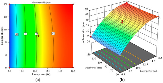 Interactive effect of laser power and number of scans on ablation width, (a) contour plot, (b) response surface plot.