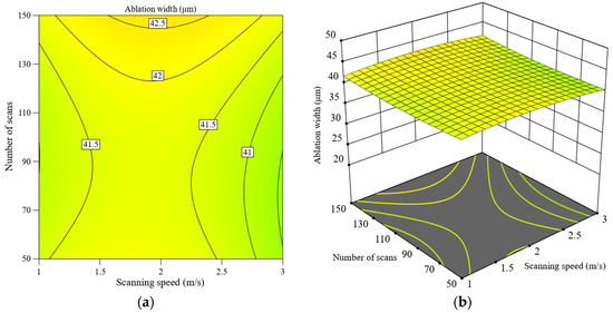 Figure 9 illustrates the interactive effect of scanning speed and the number of scans on ablation width. The closely spaced contour lines with minimal variation indicate that changes in scanning speed and number of scans have little effect on ablation width. Therefore, it can be concluded that neither parameter significantly impacts the ablation width.