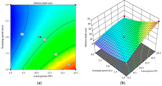Interactive effect of laser power and scanning speed on ablation depth, (a) contour plot, (b) response surface plot.