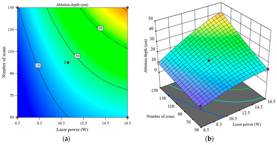 Interactive effect of laser power and number of scans on ablation depth, (a) contour plot, (b) response surface plot.