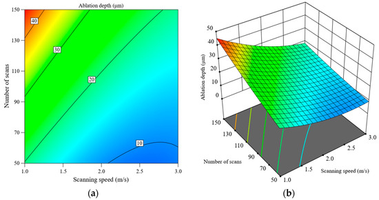Interactive effect of scanning speed and number of scans on ablation depth, (a) contour plot, (b) response surface plot.