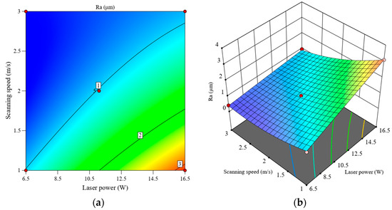 Interactive effect of laser power and scanning speed on Ra, (a) contour plot, (b) response surface plot.