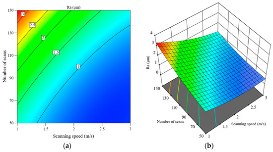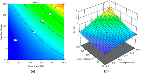 Interactive effect of laser power and number of scans on Ra, (a) contour plot, (b) response surface plot.