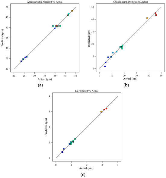 Figure 16 illustrates the correlation between the predicted and actual values of ablation width, ablation depth, and Ra in the RSM models. The predicted outcomes generated by the RSM model show a strong alignment with the actual experimental results. To assess the accuracy of the RSM model, three sets of parameters were randomly selected from the experimental data for comparative validation tests, as detailed in Table 8. The validation results showed that the error between predicted and actual values was within 8%, indicating a high degree of consistency. This consistency confirms the RSM model’s effectiveness in accurately predicting both machining efficiency and quality during femtosecond laser machining of SCD.