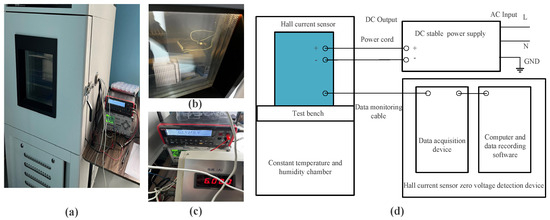 Picture and block diagram of the acceleration test platform. (a) Constant temperature and humidity chamber. (b) Hall current sensors. (c) DC stable power supply and Hall current sensor zero-voltage detection device. (d) Block diagram of the acceleration test platform.