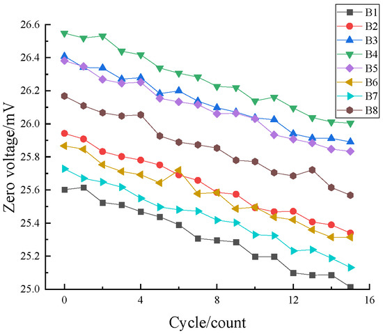 As is evident from Figure 3, the degradation curves of the zero-point voltage for the eight sensor samples under this stress are quite similar and show a linear decrease. From Figure 4, it is evident that the degradation rate of the zero-point voltage of the Hall current sensors under 80 °C-80%RH stress is significantly higher than that under other temperature and humidity stress combinations. An increase in the temperature and humidity stress combination corresponds to a more rapid degradation pace of the zero-point voltage, leading to a decrease in the performance and accuracy of the Hall current sensor.