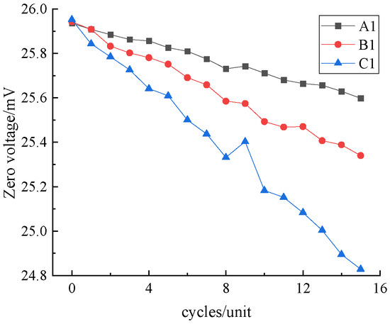 After processing the degradation data under all stress combinations using this method, the degradation curves of the zero-point voltage at 65 °C-0%RH are presented as an example in Figure 3. At the same time, to clearly compare the degradation rates of the zero-point voltage across various temperature and humidity stress levels, the degradation curves of three samples, 50 °C-60%RH-A1, 65 °C-70%RH-B1, and 80 °C-80%RH-C1, are plotted together in Figure 4.