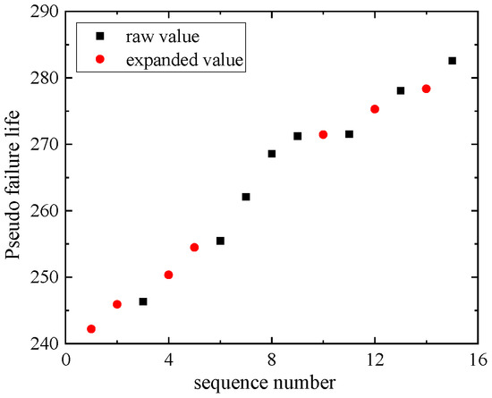 To determine the fit between the original pseudo-failure life data and the expanded data, a comparison result graph of the original sample’s pseudo-failure life data and the expanded data is provided, as shown in Figure 5.