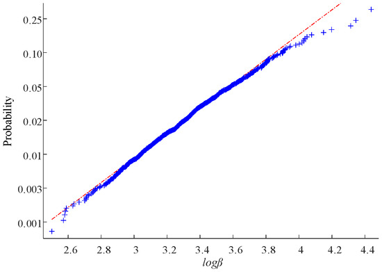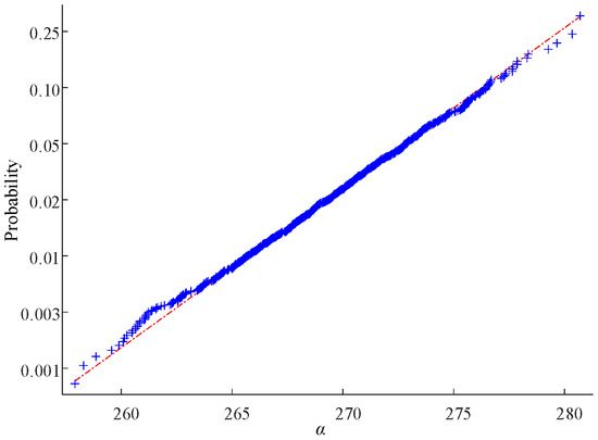 Using the distribution test scatter plot to test the distribution of the two parameters, the results indicate that α and β follow the normal distribution and log-normal distribution, respectively. Figure 6 and Figure 7 show the normal distribution and log-normal distribution test results for α and β at a confidence level of 95%, respectively.