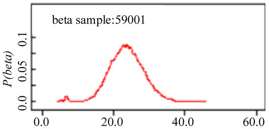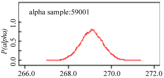 As can be seen from Table 5 and Table 6, the more iterations there are, the more stable the mean values of α and β become, and the error of the MC sampling is gradually decreasing. The posterior probability density of α and β after 60,000 iterations is shown in Figure 8 and Figure 9.