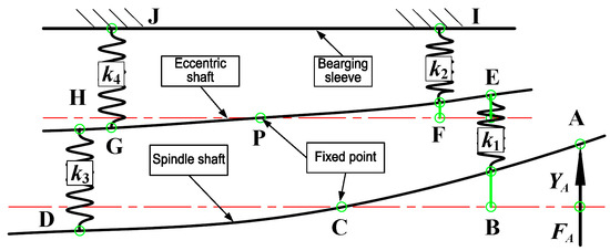 Since the sleeve is fixed on the machine tool, the deformation of the sleeve is not considered. The static mechanics model is established as shown in Figure 4, where points P and C are the theoretical rigid body displacement fixed points of the eccentric shaft and the spindle shaft when the spring deforms.