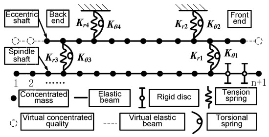 The dynamic model of the spindle–eccentric shaft system is established based on the overall transfer matrix method, in which the bearing is simplified as a tensile spring and a torsional spring. The flange and spindle bolt connections are treated as rigid connections and simplified as a rigid disk. To make the spindle and eccentric shaft have the same number of elements, virtual elements with zero mass and zero shaft segment length are added at corresponding positions, as shown in Figure 5.