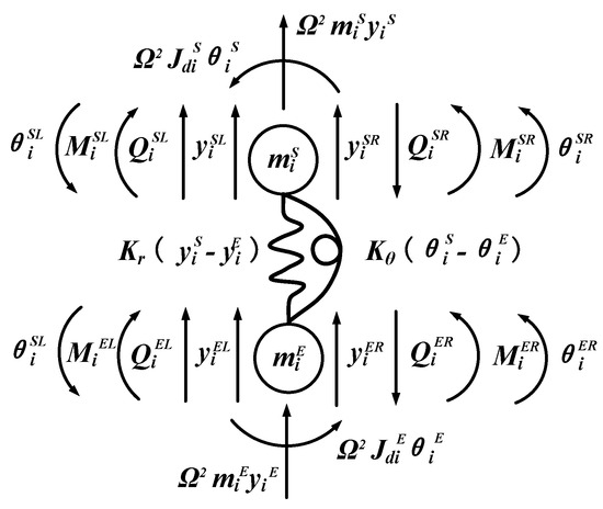 For concentrated mass units connected by bearings, considering the bearing effect, the force relationship is shown in Figure 7. Note that the subscript i represents the i-th mass unit, the superscript S represents the main axis, E represents the eccentric axis, L represents the left side of the mass unit, and R represents the right side of the mass unit.