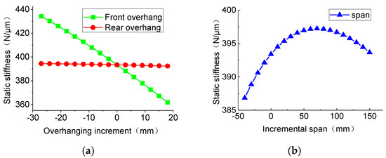 From Figure 8 and Figure 9, the influence of the three parameters on static stiffness and first-order critical speed is consistent. Among them, the front overhang has the most significant impact on both. The optimal spindle shaft bearing span increment for static stiffness and first-order critical speed are different, being 70 mm and 30 mm, respectively.