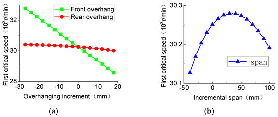 Influence of suspension and span on first-order critical speed: (a) eccentric shaft overhang; (b) spindle span.
