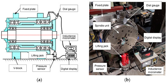 The static stiffness measurement scheme of the three-shaft assembly is shown in Figure 12. The spindle box is fixed on the V-block by the pressing plate, and a jack and pressure sensor are placed at the bottom of the flange. The jack applies force continuously, measuring the deformation of the flange in the vertical direction. The pressure value on the digital display and the deformation on the inductive displacement sensor within the linear range are recorded. The measurement is repeated four–five times, with five–six data points each time. The data points are linearly fitted and averaged to obtain the static stiffness value of the spindle shaft.