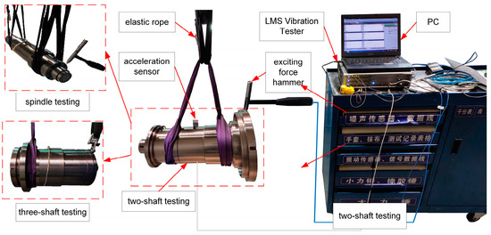 Modal tests were conducted on the two-shaft and three-shaft assemblies measured for static stiffness to measure the dynamic characteristics of the spindle system. The modal test of the two-shaft assembly is shown in Figure 13, using the hammering method with a single-point input and a multi-point output. The spindle assembly is suspended by elastic ropes to simulate the free state of the spindle assembly. The flange is struck by a hammer, and the vertical vibration acceleration at 20 measurement points on the eccentric shaft is measured by an acceleration sensor. The modal information of the tested system is ultimately processed and analyzed through the LMS vibration testing system.