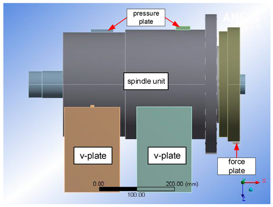 Since the internal spindle’s mode shape cannot be obtained in the modal test, a corresponding FE simulation model is established in ANSYS Workbench 15.0 to assist in verification. The spindle box model is imported into the model module, and the corresponding material properties are added. The bearings are usually simulated with four or more spring elements, but using the bushing element to simulate the bearing’s effect also achieves good simulation results and is simpler to set up. An FE model of the static stiffness measurement experiment is also established to further verify the reliability of the bushing element set up, as shown in Figure 14.