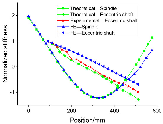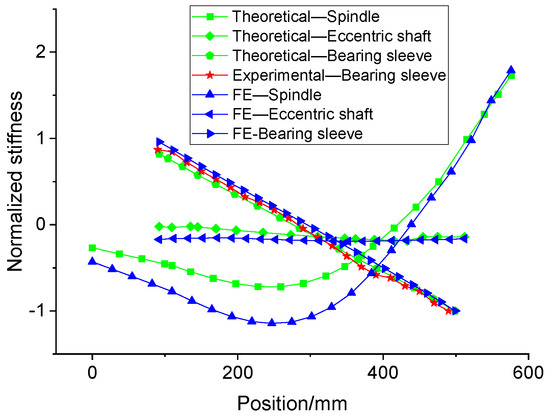 From Table 1, it can be seen that, regardless of the assembly form, the static stiffness values calculated from the static model are quite close to the experimentally measured values, with relative errors within 5%, thus confirming the accuracy of the static model calculations. From Table 2 and Figure 15 and Figure 16, the static stiffness and mode shapes of the theoretical model, experiment, and FE simulation for both the two-shaft and three-shaft assemblies have errors within 10%, and the mode shapes of the three are in good agreement, indicating that the static and dynamic models have good reliability. In addition, the maximum error occurs in the three-axis test. This is because the spindle–eccentric shaft-sleeve assembly cannot be suspended solely with an elastic cord, so a chain was used for suspension during the test.